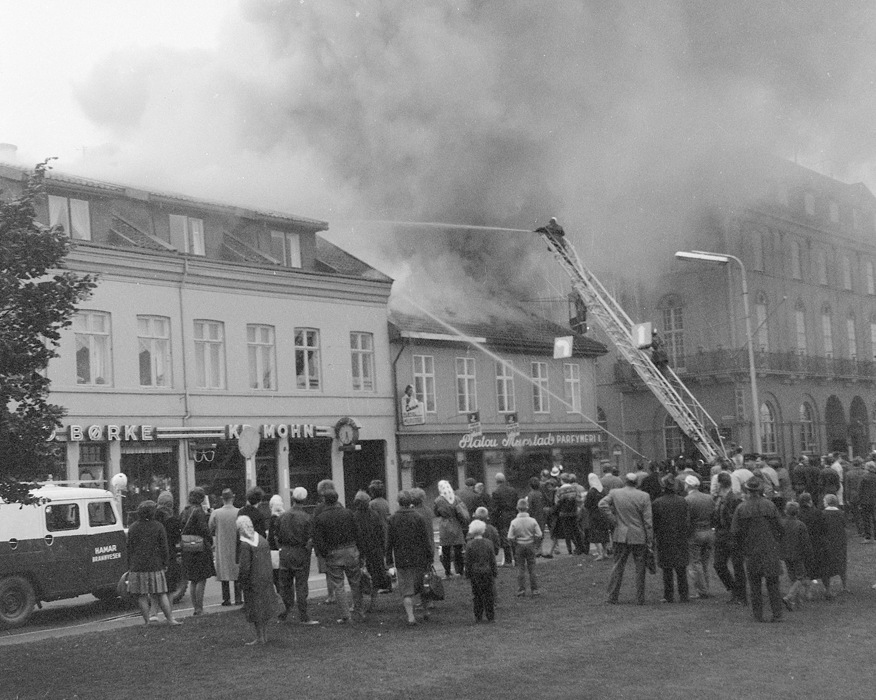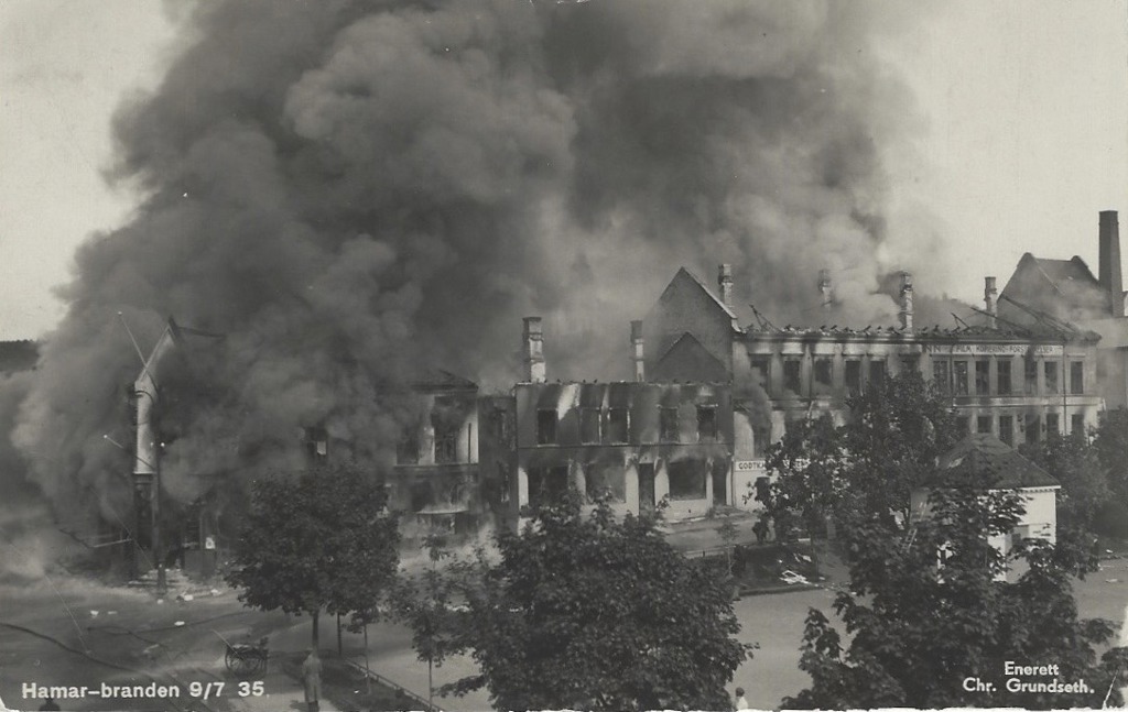 I Hamar Arbeiderblad for 11. juli 1935 leser vi: «Hamar ble igår formiddag herjet av en grufull brandkatastrofe. Hele kvartalet ovenfor Østre Torv mellem Torvgaten og Grønnegaten er lagt i aske, og en del forretninger i Torvgaten mellem Kooperativet og Singer Symaskinforretning er så brandherjet at alt må rives og bygges op fra grunnen igjen. I løpet av et par timer gikk verdier for mye over en million kroner op i flammer... Like før klokken halv ni blev en av Østlendingens journalister, Ola Himberg-Larsen, opmerksom på at ild var løs i bakgården hvor Østlendingen har sin makulatur lagret. Han varslet øieblikkelig brandvesenet, og et par minutter senere ulte brandsirenene over byen. Begge brandbilene blev hurtig bemannet. Et lite øieblikk efter var mannskapet på pletten. Bare på denne korte tid hadde ilden grepet uhyggelig om sig i de tørre trebygninger. Fra Østlendingens papirloft hvor den selvsagt fikk den beste næring, slo den med en gang over i en rekke uthus som kvartalets murhus ut mot gaten skjuler....På mindre enn et kvarter stod Posthusbygningen, M. Steens forretningskompleks, Kr. Flåteruds forretningsgård og fotogr. Carl Normanns laboratorium i lys lue.....Som man mente å beherske ilden, slengte den sig plutselig over Torvgaten og grep fatt i taket over gullsmed Libergs forretning...