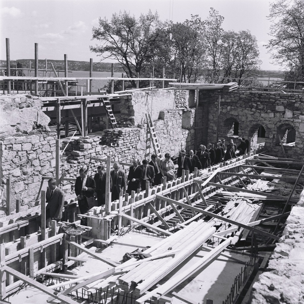 Innsats med å gi den gamle låven nytt liv, innhold og mening. På bildet er formannskapet på befaring, og vi ser en rekke kjente Hamar-politikere og administrative ledere i kommunen. Helt i front går Asbjørn Mo. Langt fremme, som nummer fem, ser vi fylkesmann Alf Frydenberg. Låven, som har en historie tilbake til 1500-tallet, ble dels brukt som låve, dels som driftsbygning for Storhamar gård til langt inn på 1900-tallet. Etter at den hadde stått ubrukt i noen tiår overtok Hedmarksmuseet den i 1946. Da var den i svært dårlig stand – men så kom Sverre Fehn med sine ideer!