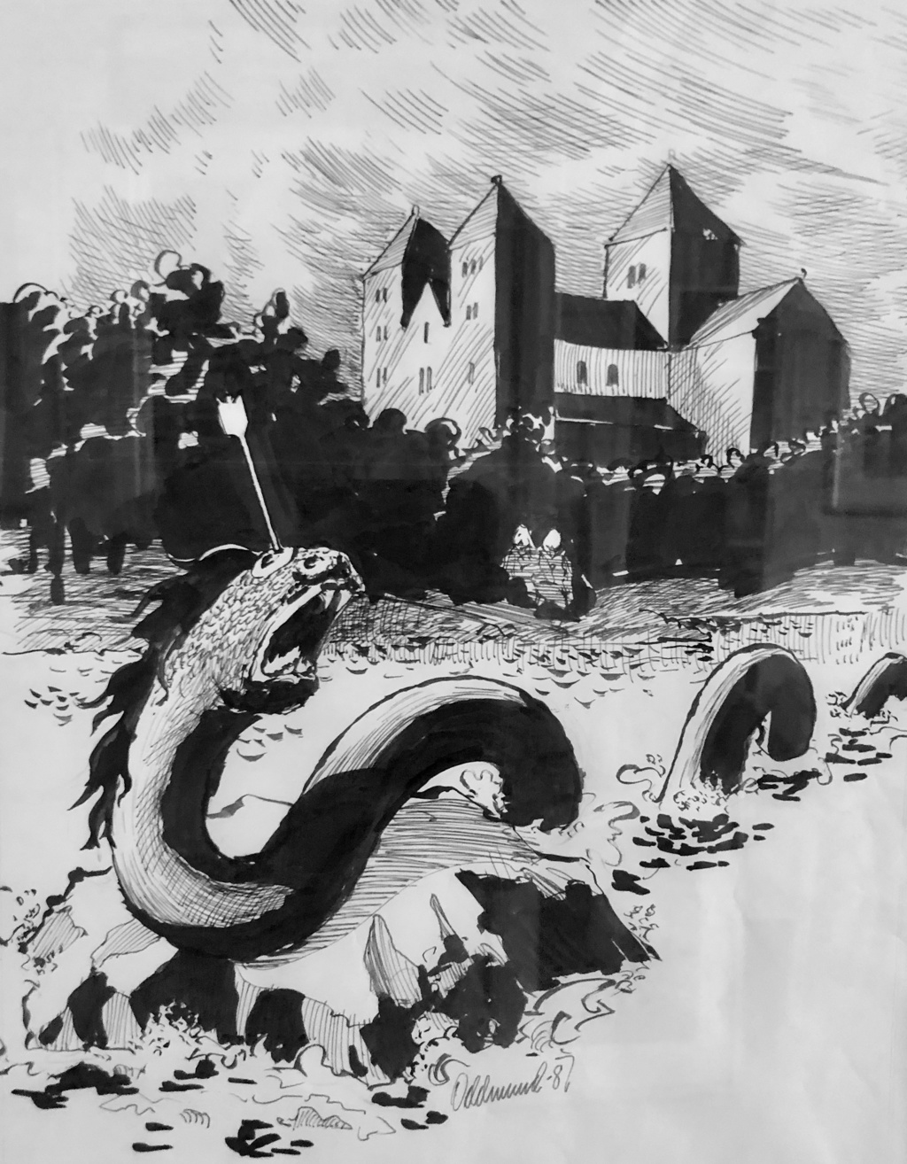 Det skeede udi Hammers Domkierke, at om Midnats Tide ginge alle Klokkerne og Orgelverket af sig selv, og som Bispen det hørde stod han op og saa ud. Da var det saa lyst udi Domkierken og Koret ligesom det havde været lys Dag. Sammeledes ginge og Klokkerne udi Klostret og udi Korskierken af dennem selv, saa hørdes der ogsaa den Nat megen Spøgeri paa Bispegaarden ligesom to Krigshere skulde slaas sammen, saa at Vekterne og Folkene derover forfædes. Sammeledes lod sig til Syne om lys Dag en forferdelig stor Sjøorm udi Mjøs som syntes at naa fra øens Land og ind i Kongens Land.